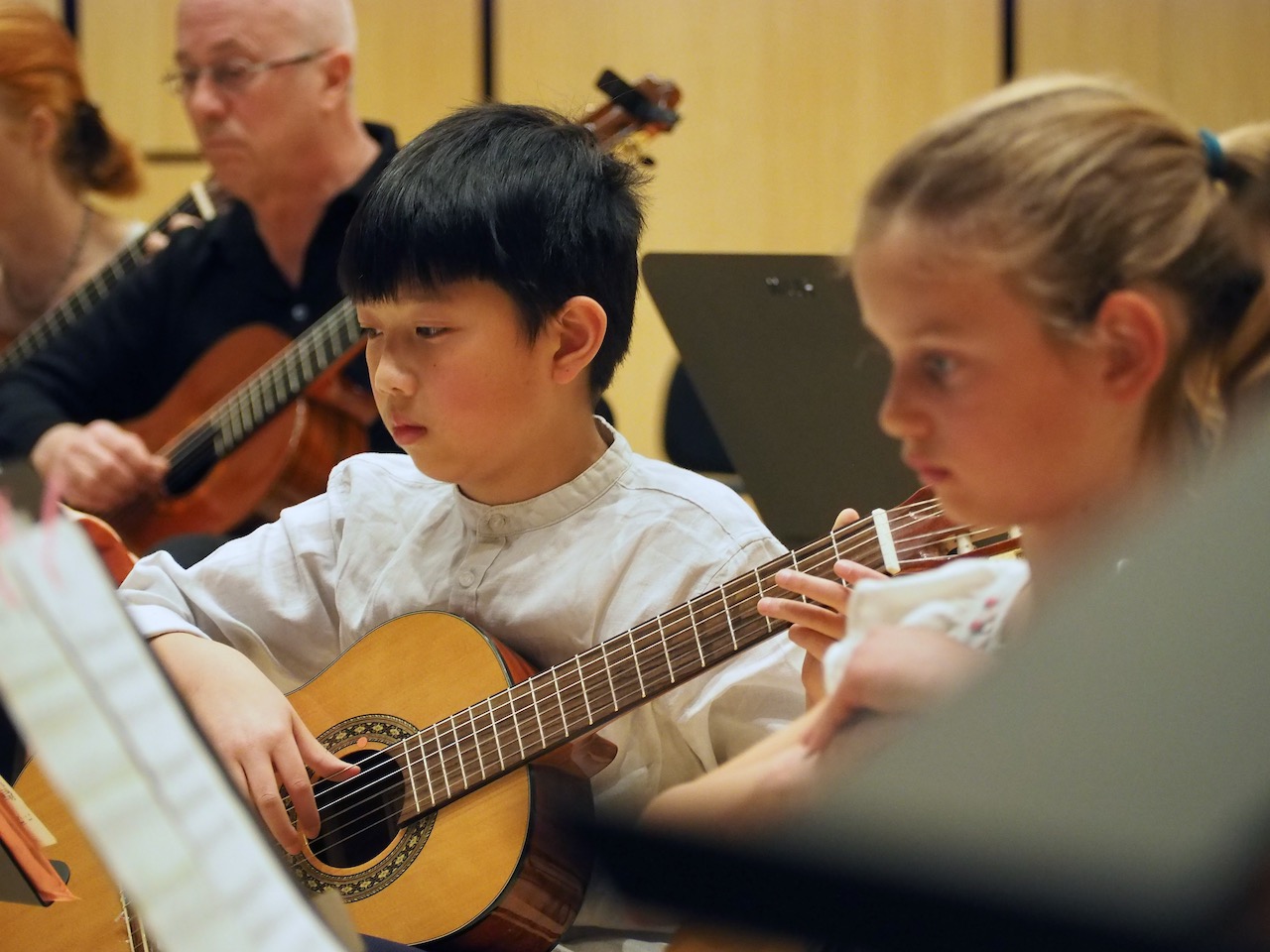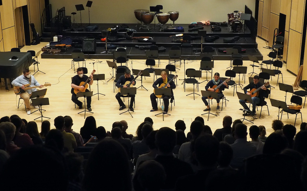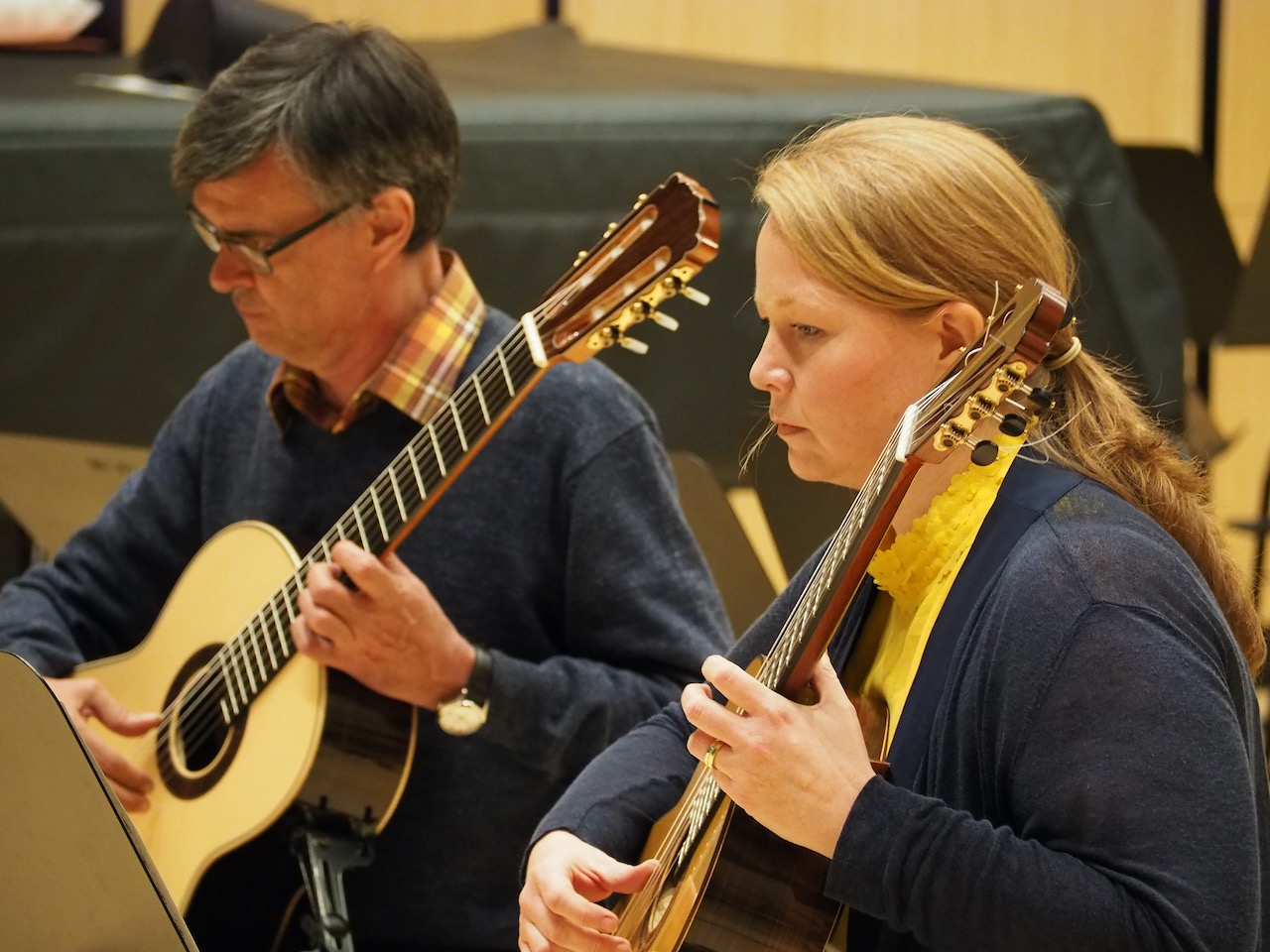 In kleinen und großen Ensembles spielten am Sonntag, 27. März 2022 unter der Leitung von Thomas Wagner und Katrin Kramer fast 50 Spieler*innen mit ihren Gitarren im FILUM Konzertsaal.