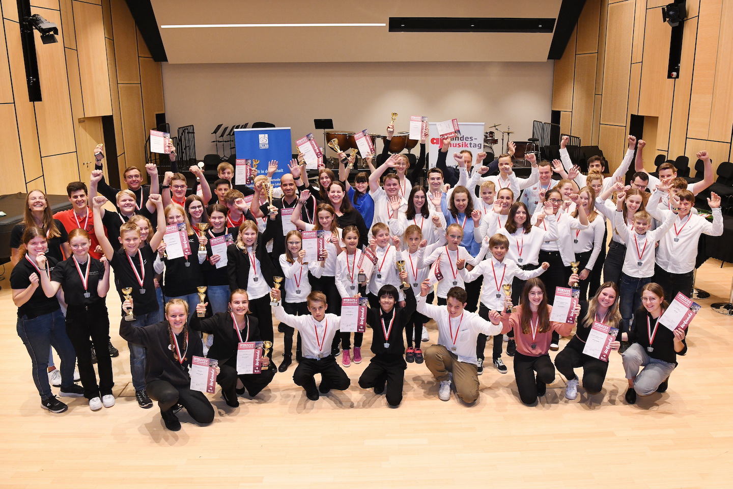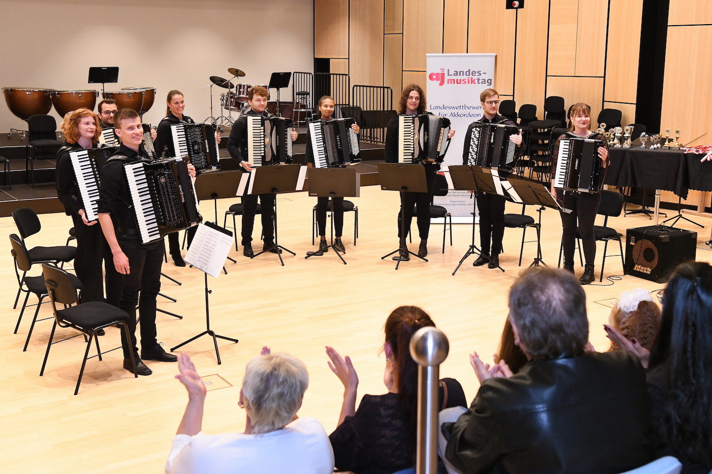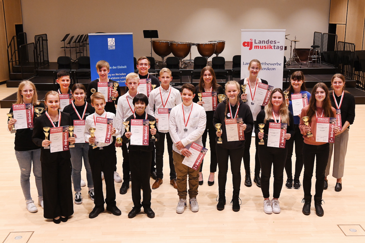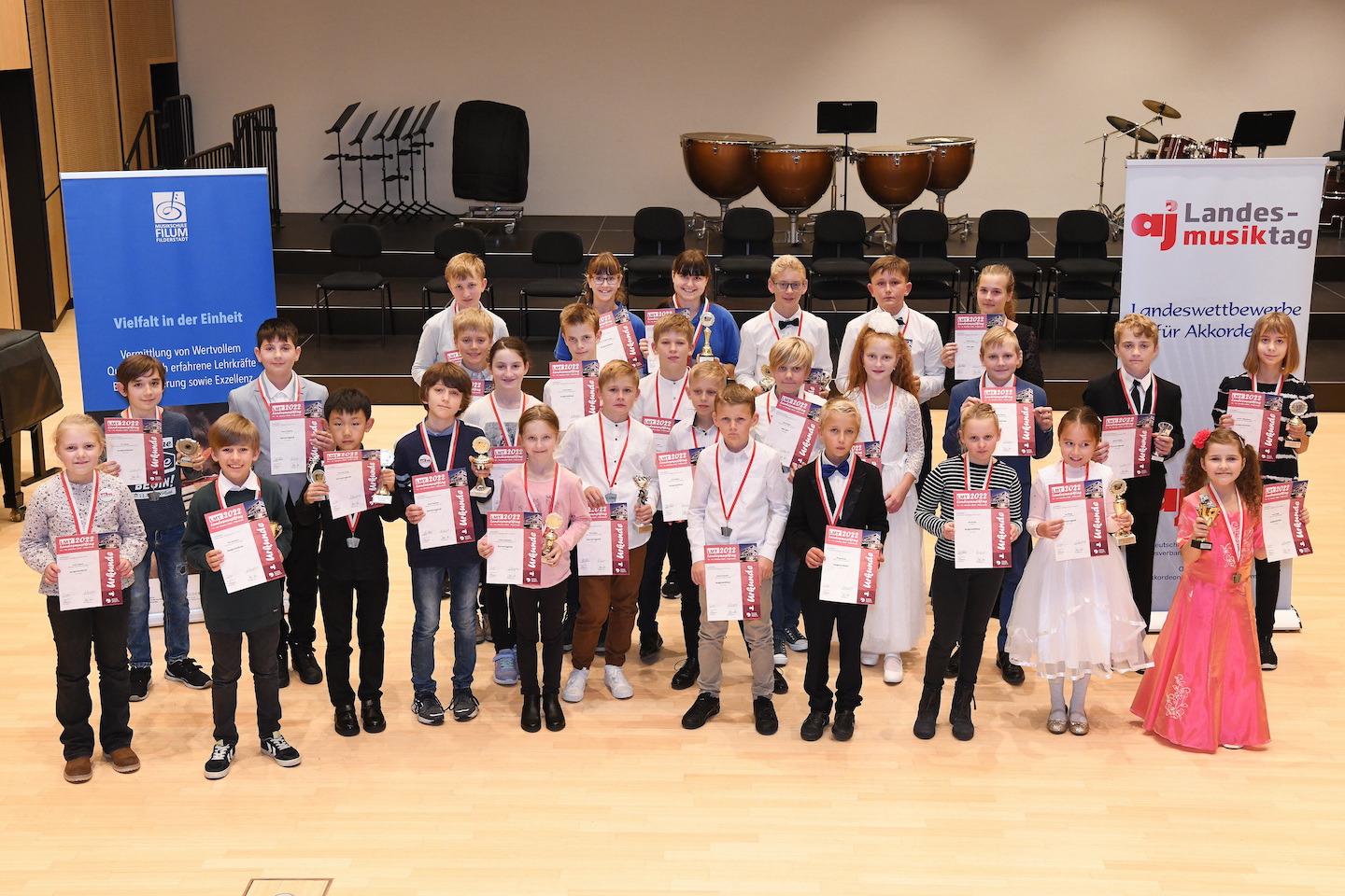 Der Landesmusiktag 2022 für Akkordeon belebte am vergangenen Wochenende das FILUM wieder auf gewohnte Weise. Musikschulleiterin Katrin Bleier mit Organisator und Lehrkraft für Akkordeon Rolf Weinmann vom FILUM sowie Gerhard Girrbach vom Landesverband BW des Deutschen Harmonikaverbandes durften dabei vielen Preisträger*innen gratulieren und Urkunden sowie Pokale überreichen. Das Ensemble „AkkZente“, das aus ehemaligen Teilnehmer*innen des Landesmusiktages besteht, begeisterte im Rahmenprogramm der ersten Preisverleihung.