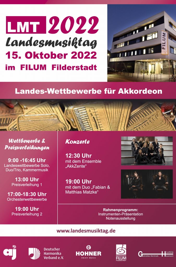 Am kommenden Samstag, 15. Oktober 2022, ist es wieder so weit: Der LANDESMUSIKTAG mit Wettbewerben für Akkordeon Solo, Duo, Kammermusik und Akkordeon-Schülerorchester am FILUM in Filderstadt startet um 9:00 Uhr.