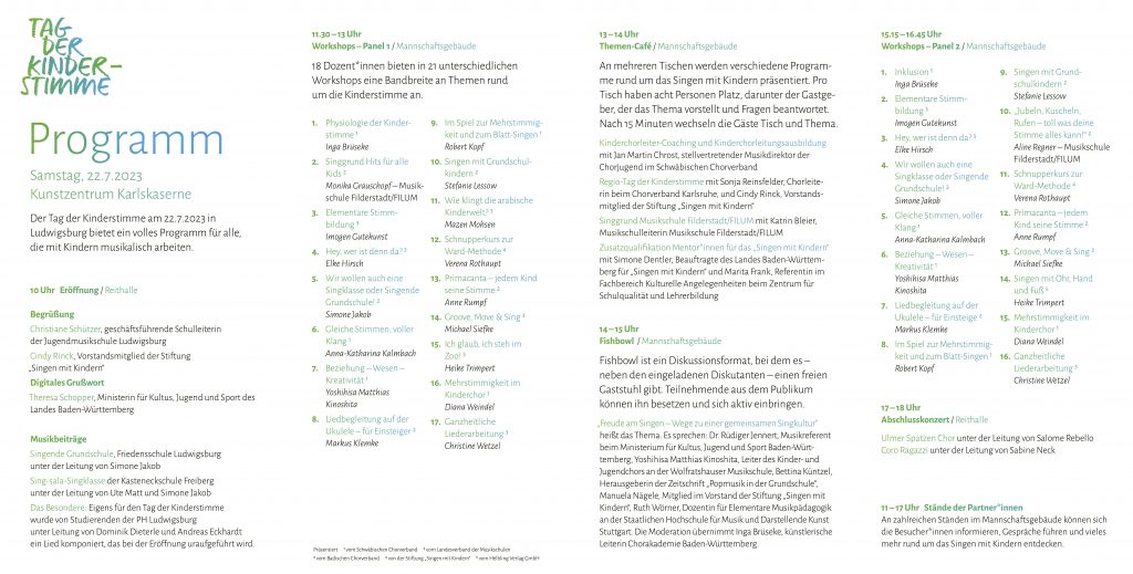 Vorträge und Workshops wird des beim „Tag der Kinderstimme“ u.a. mit unseren Lehrkräften Monika Grauschopf und Aline Regner sowie Musikschulleiterin Katrin Bleier geben. Herzliche Einladung dazu!