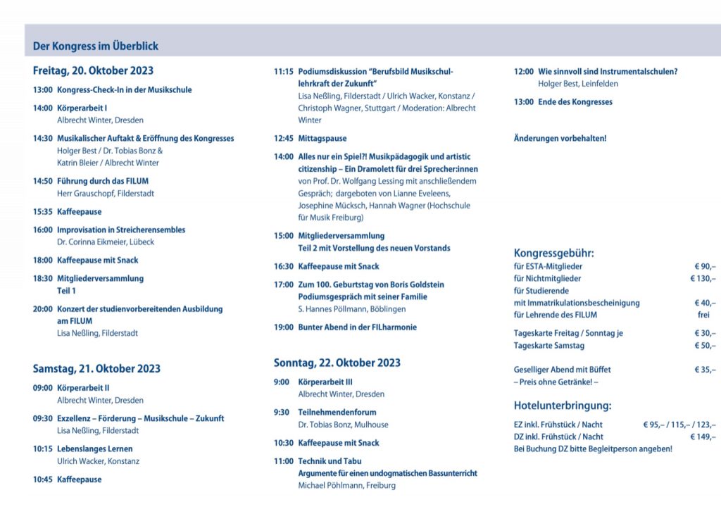 Dies sind einige Themen und Veranstaltungen, auf die sich das Publikum freuen darf: Körperarbeit, Improvisation in Streicherensembles, Exzellenz-Förderung-Musikschule-Zukunft, Lebenslanges lernen, Zum 100. Geburtstag von Boris Goldstein – Podiumsgespräch mit seiner Familie u.v.m.