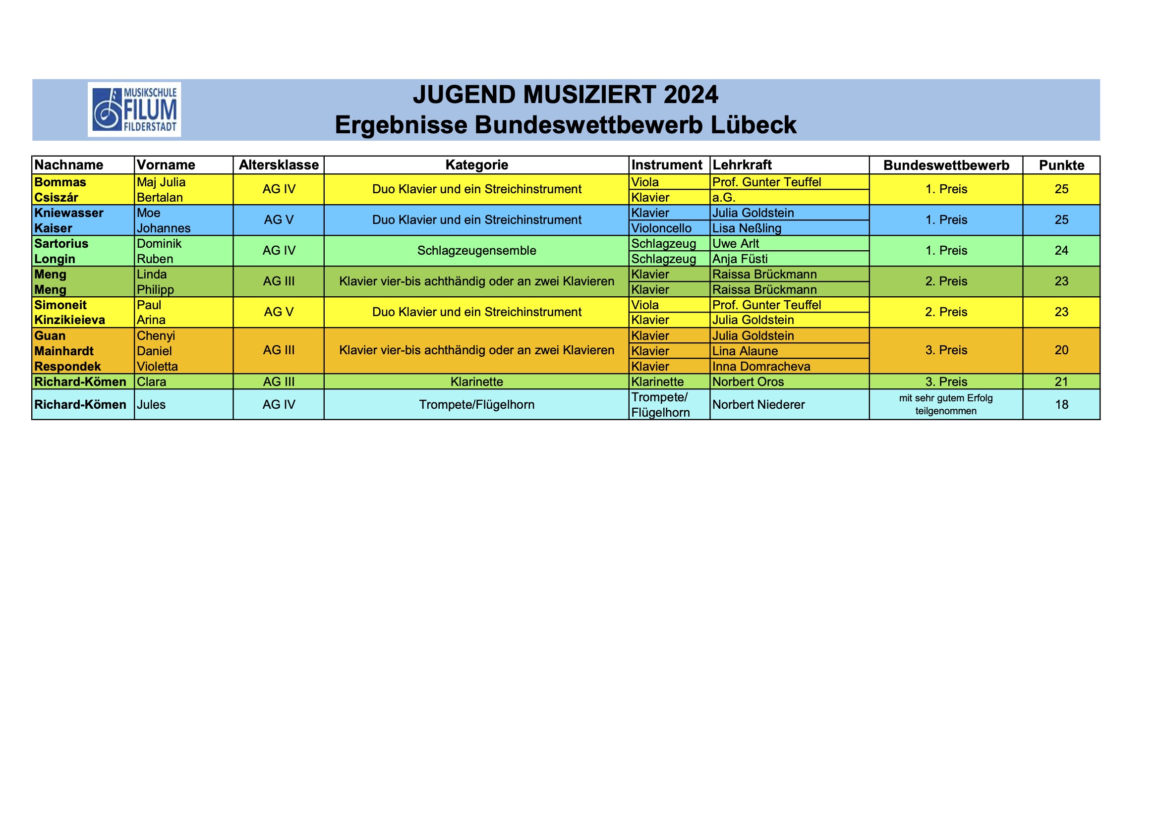 Das ganze Musikschulteam gratuliert unseren Schüler*innen mit ihren Lehrkräften zu den fantastischen Ergebnissen beim Bundeswettbewerb „Jugend musiziert“ in Lübeck. Mit Erstplatzierten der Landeswettbewerbe aus ganz Deutschland war die Konkurrenz groß und das Niveau entsprechend hoch. Wir sagen nochmals herzlichen Glückwunsch an alle Schüler*innen und herzlichen Dank an alle Angehörigen für die Unterstützung.