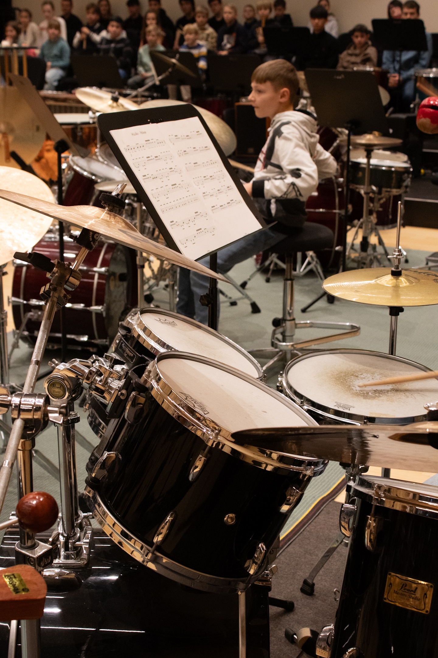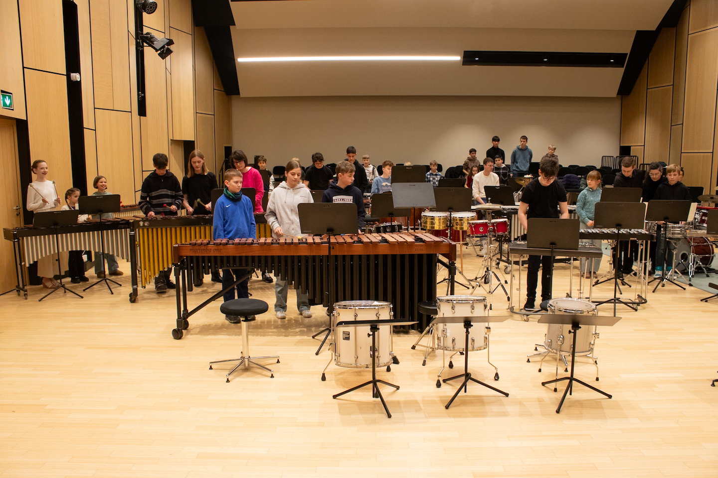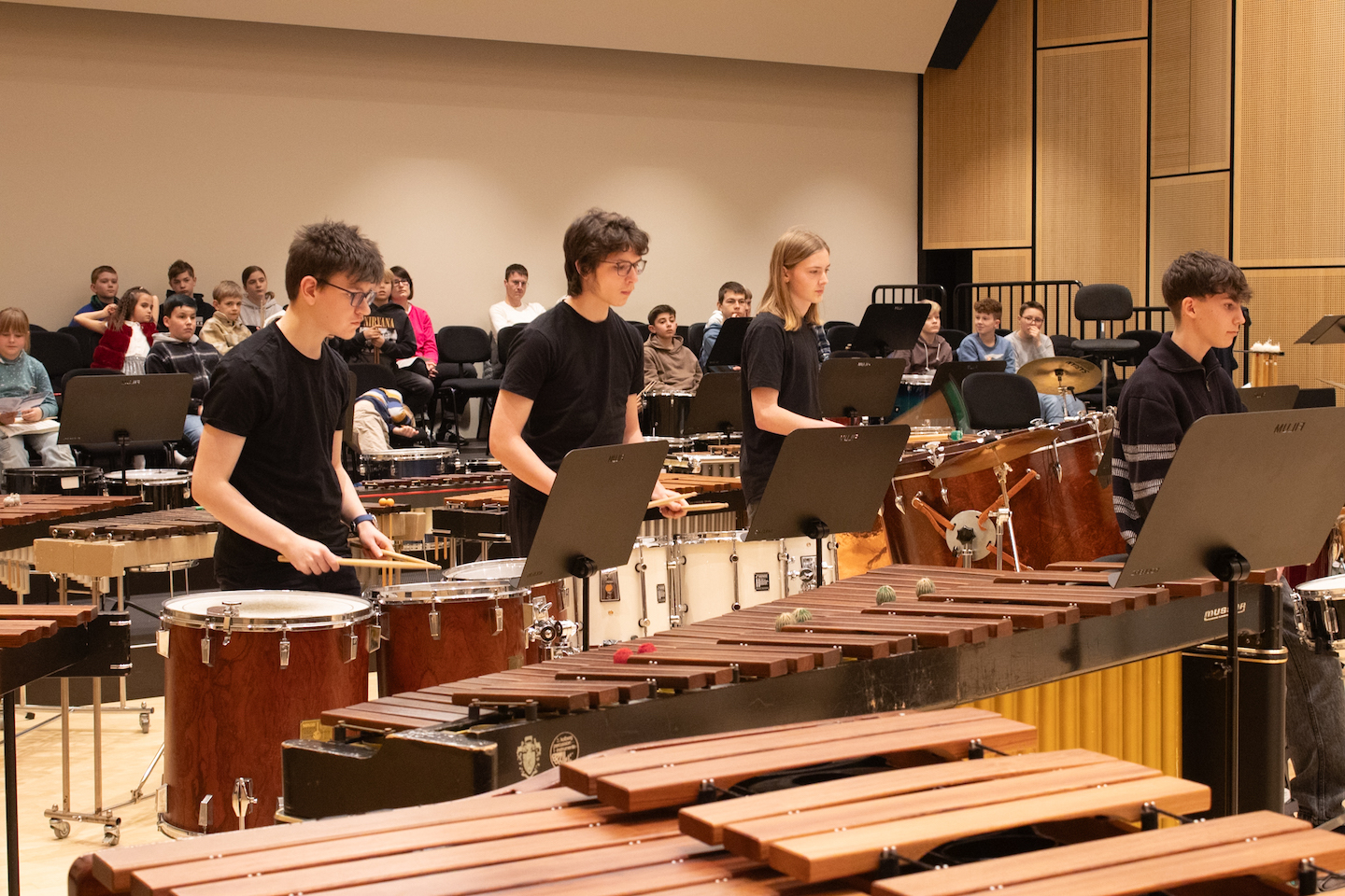 Doch das war erst der Anfang: Am Samstag und Sonntag folgten die beiden Jahreskonzerte des Fachbereichs Percussion im FILUM Konzertsaal. Hier wurde die gesamte Bandbreite des Schlagwerks präsentiert – von Drums über Marimba bis hin zum kompletten Schlagzeug in all seinen Facetten. Sogar ein selbstgebautes Instrument sorgte für Begeisterung. Am zweiten Tag gab es dann noch eine besondere Überraschung: Eine Vorgruppe begeisterte das Publikum im vollen Konzertsaal, bevor das eigentliche Konzert begann.