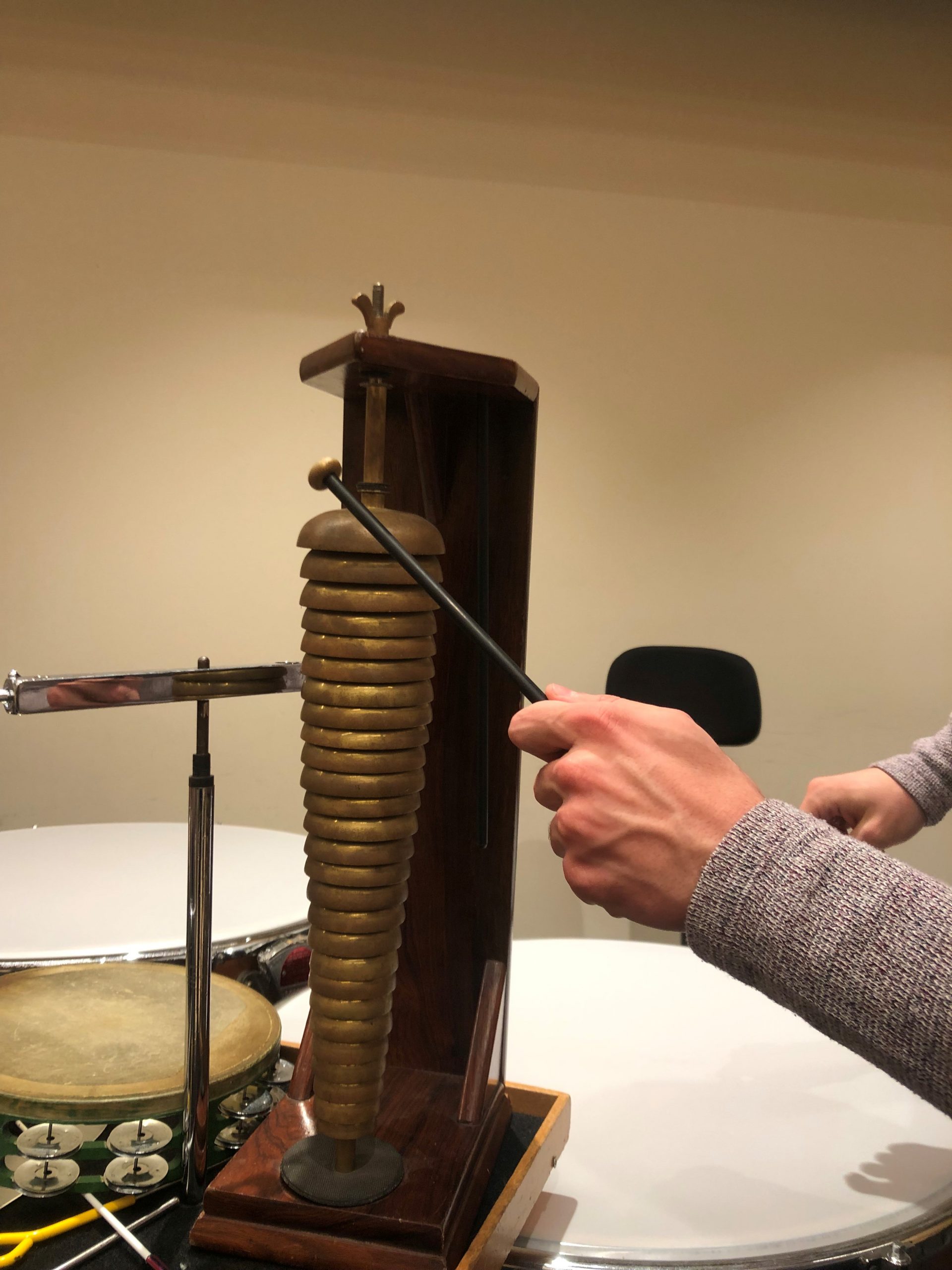 René: Röhrenglocken sind auch noch eine Herausforderung für sich. Beim Spielen hat man zwei Möglichkeiten: Entweder, man baut sie vor sich auf – dann sieht man nichts mehr vom Dirigenten, und der Dirigent nichts mehr von einem. Alternative: man baut sie schräg auf, und dann kann man den Dirigenten erst recht nicht anschauen. Die Röhrenglocken sind auch so laut, dass man vom Orchester nichts mehr hört, das muss sich dann nach einem richten. Herr Wieland gibt den Takt an, die Röhrenglocken setzen ein, und dann heißt es: Augen zu und durch. Ziemlich wild.