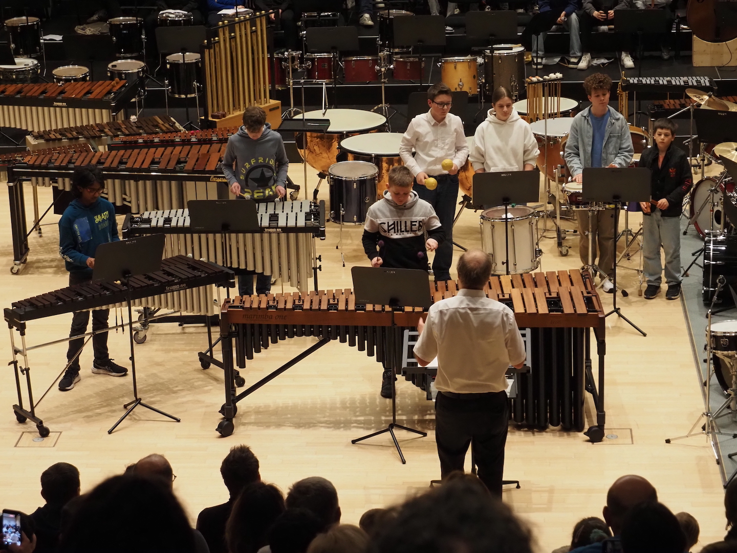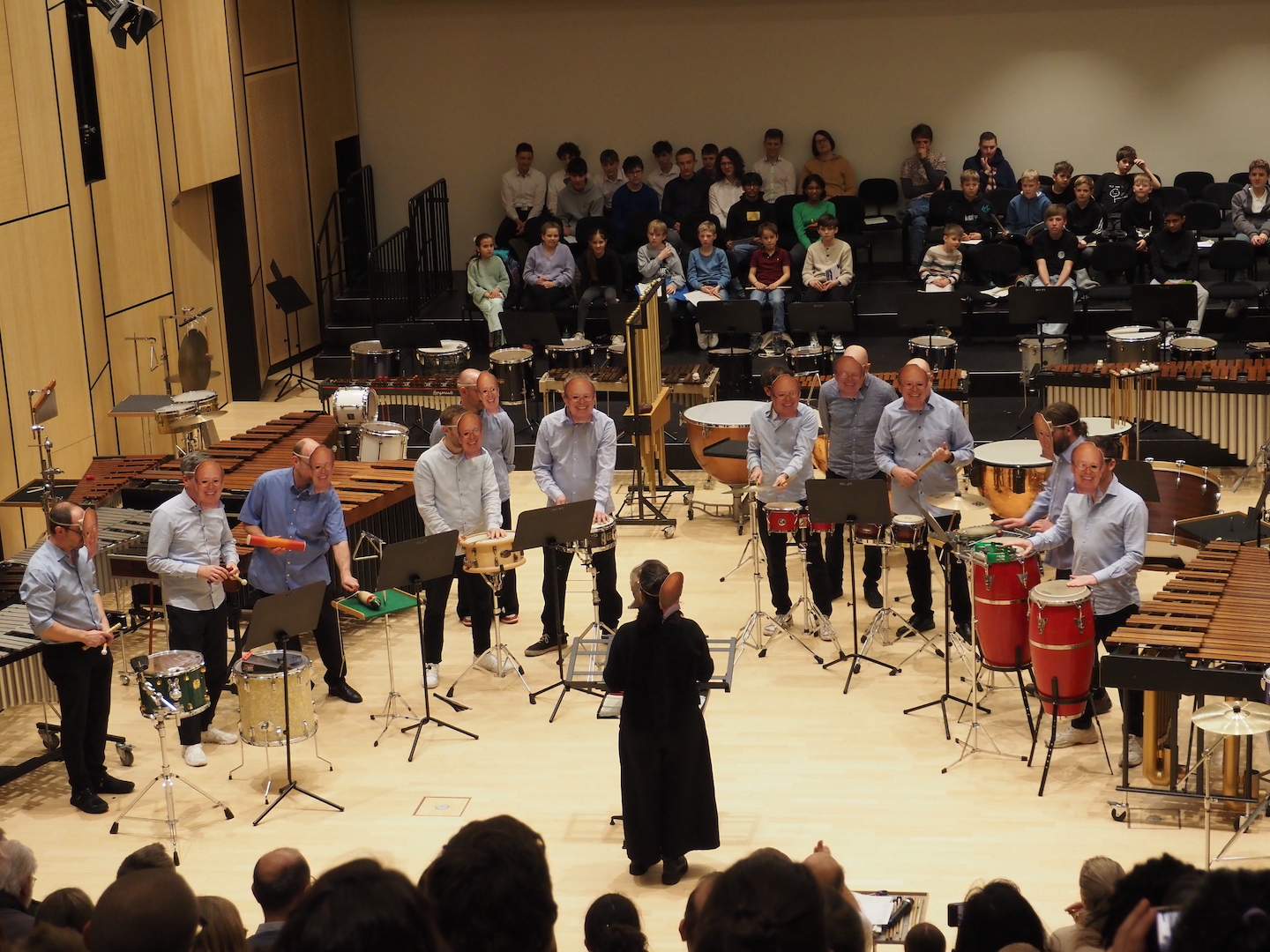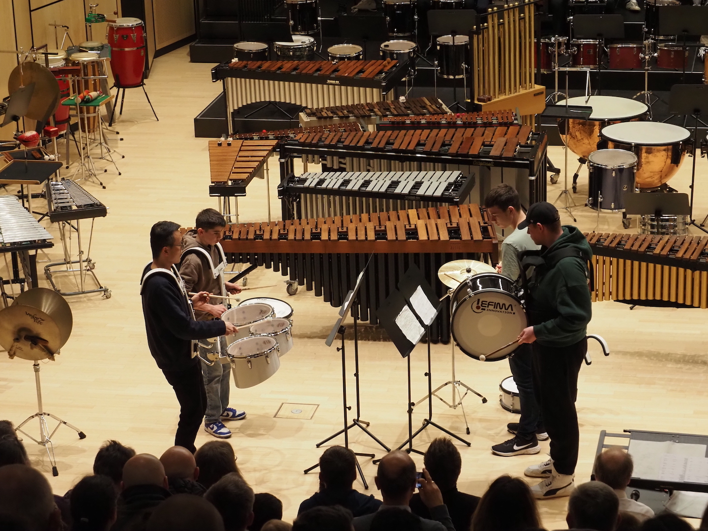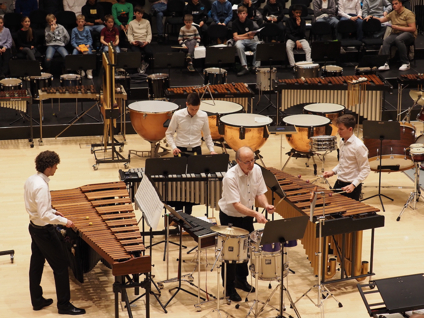 Schon beim Betreten des Saales bot sich ein beeindruckendes Bild. Marimbas, Vibraphone, Pauken, Trommeln, Becken, Drumsets und zahlreiche weitere Schlaginstrumente füllten die Bühne – ein faszinierendes Panorama der Percussion-Welt. Wenn alle diese Instrumente gemeinsam erklingen, entsteht eine Klangvielfalt, die den ganzen Raum erfüllt und das Publikum unmittelbar mitreißt.