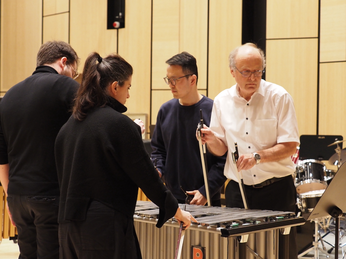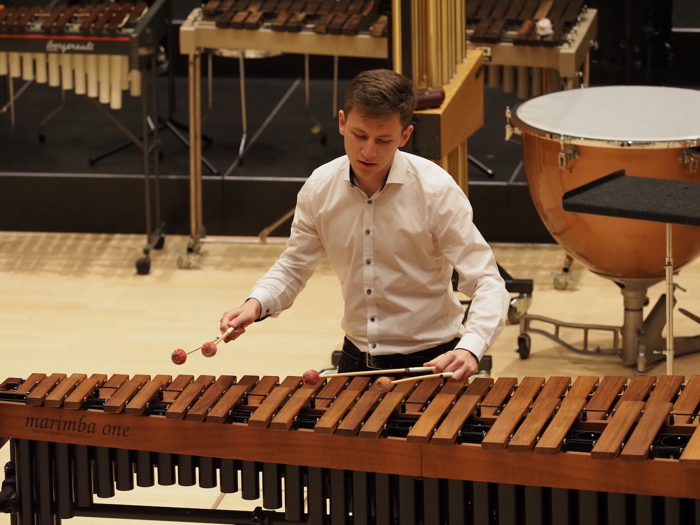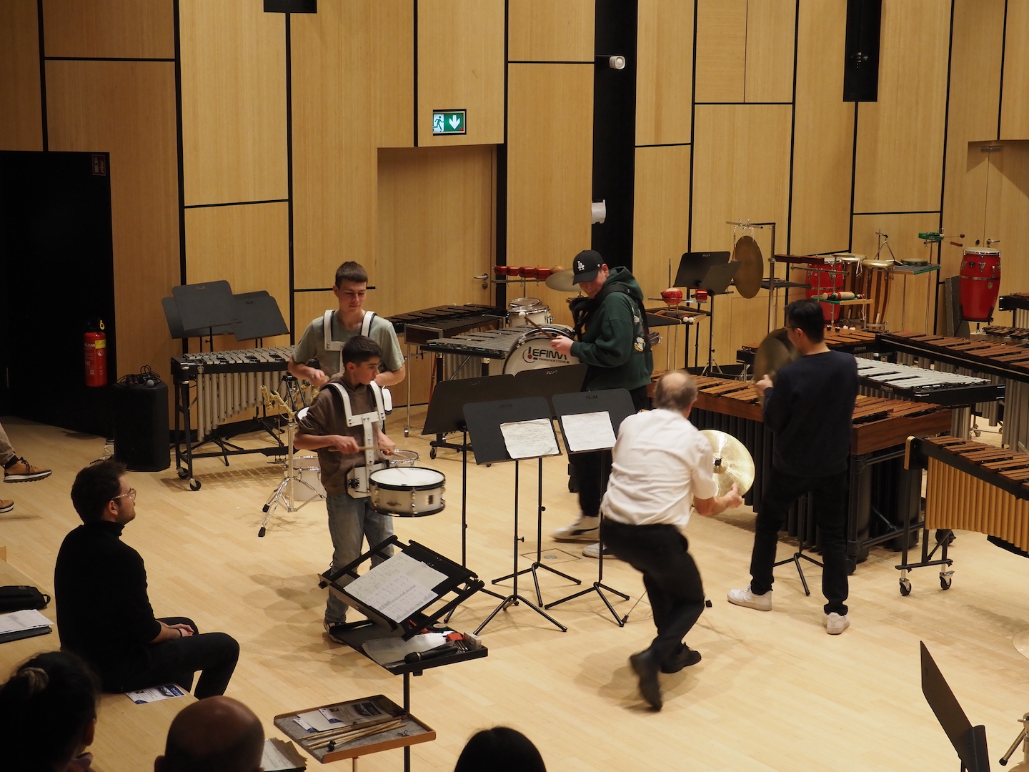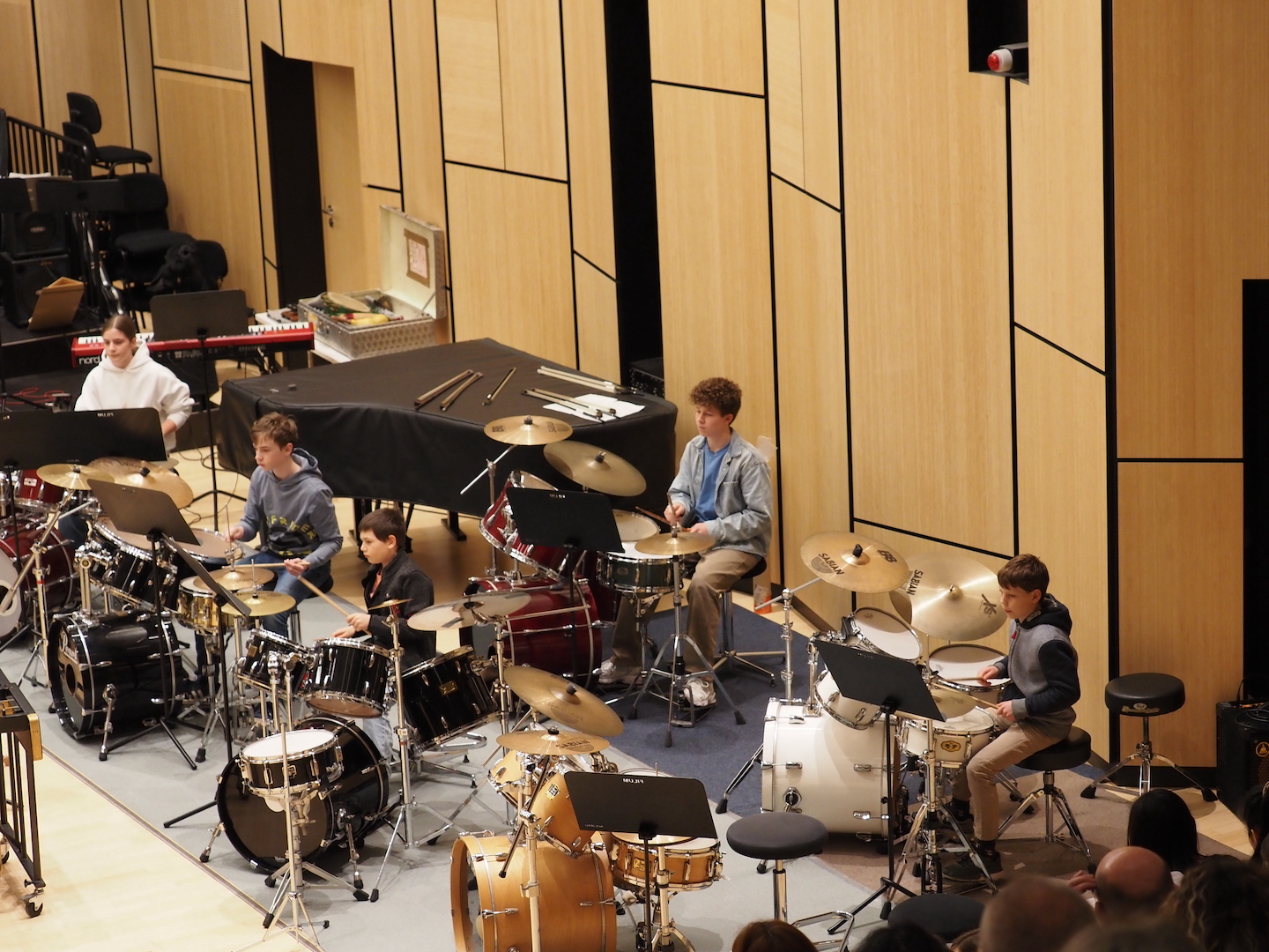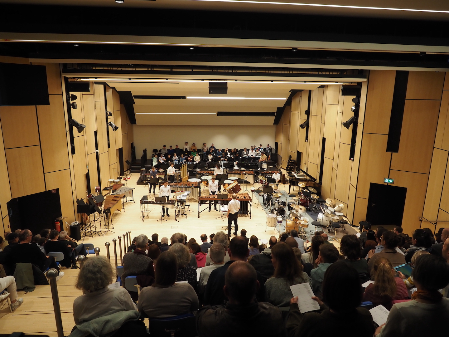 Schon beim Betreten des Saales bot sich ein beeindruckendes Bild. Marimbas, Vibraphone, Pauken, Trommeln, Becken, Drumsets und zahlreiche weitere Schlaginstrumente füllten die Bühne – ein faszinierendes Panorama der Percussion-Welt. Wenn alle diese Instrumente gemeinsam erklingen, entsteht eine Klangvielfalt, die den ganzen Raum erfüllt und das Publikum unmittelbar mitreißt.