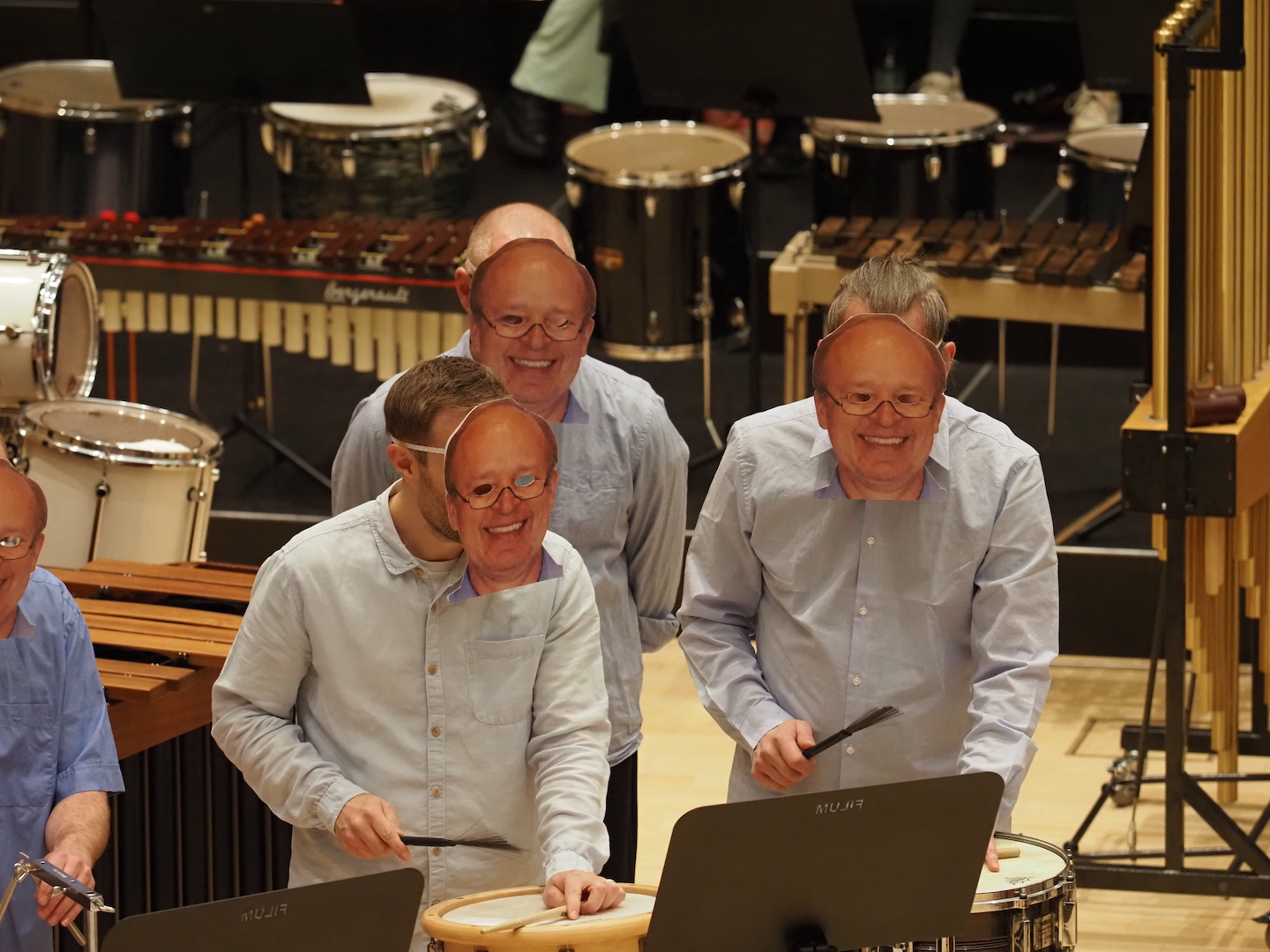 Ein besonders emotionaler Moment des ersten Konzerts war eine gelungene Überraschung für Fachbereichsleiter Uwe Arlt. Zahlreiche ehemalige Schülerinnen und Schüler hatten sich zusammengefunden, um ein Stück aufzuführen – allerdings mit einer humorvollen Idee: Sie trugen Masken mit dem Gesicht ihres ehemaligen Lehrers. Das sorgte für große Heiterkeit im Saal und gleichzeitig für einen bewegenden Moment, der zeigte, wie sehr Uwe Arlt Generationen von Musiker*innen geprägt hat. Denn dieses Konzertwochenende war auch ein besonderer Moment für Ihn, da es die letzten Jahreskonzerte unter seiner Leitung waren. Sein unermüdlicher Einsatz, seine Begeisterung für die Welt der Percussion und seine Arbeit mit unzähligen Schüler*innen haben den Fachbereich über Jahrzehnte hinweg geprägt.